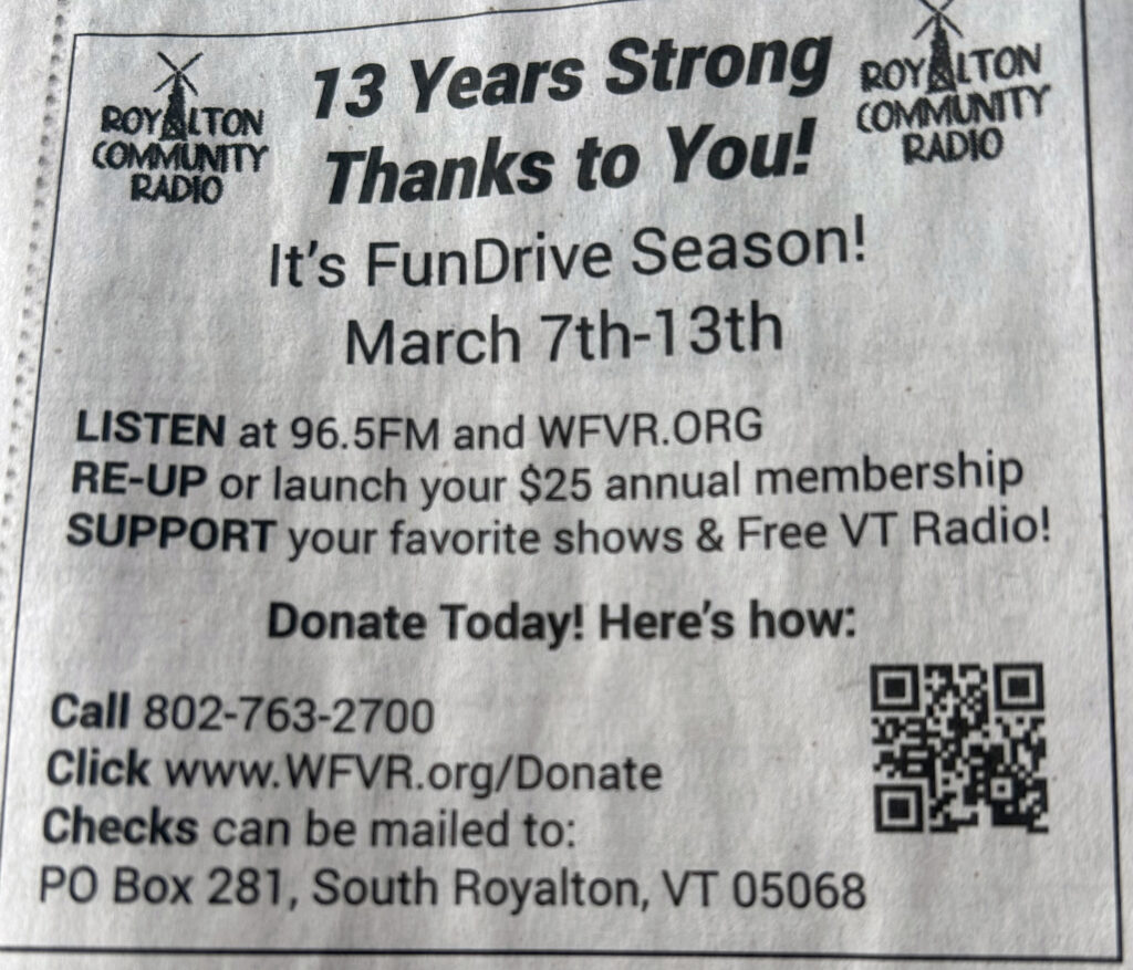 Free Vermont Radio's "exclusive" once a year FunDrive kicks on Saturday, March 7th. We will reach our official lucky 13th Anniversary on Tuesday, March 9th. And YES, there will be a party to celebrate our devoted members, underwriters and staff just down the road at the Seven Stars Arts Center from 6-10PM on Saturday, March 14th. All food/libations/music provided by us!