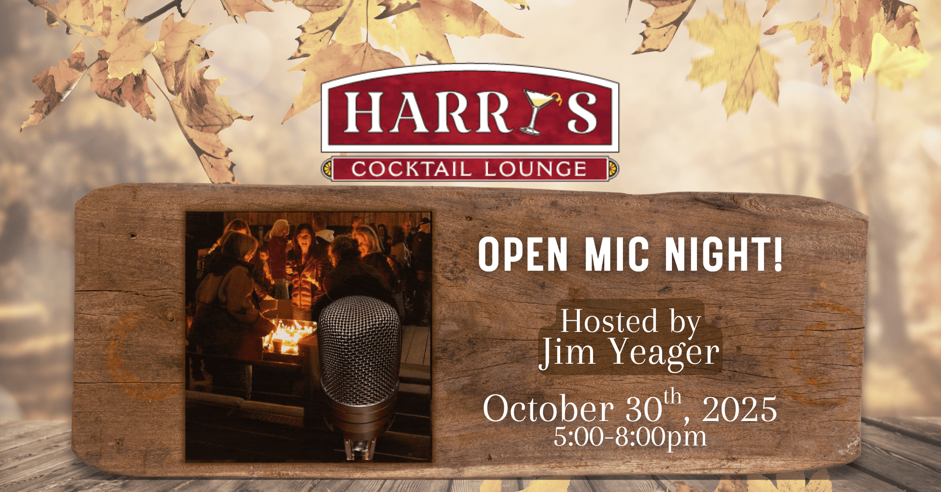 Open Mic Night hosted by Jim Yeager at Harry’s Cocktail Lounge in Quechee! By WFVR Music | October 30, 2025 When October 30, 2025 5:00 pm - 8:00 pm Add To Calendar Download ICS Google Calendar iCalendar Office 365 Outlook Live Where Harry's Cocktail Lounge at Vermont Spirits 5573 Woodstock Rd (Route 4 Queche Gorge), Quechee, VT Event Type Music Open Mic Night hosted by Jim Yeager October 30 @ 5:00 pm – 8:00 pm Add to calendar DETAILS Date: October 30 Time: 5:00 pm – 8:00 pm Event Category: Live Music Event Tags: Community, Local Talent, Open Mic Posted in Music